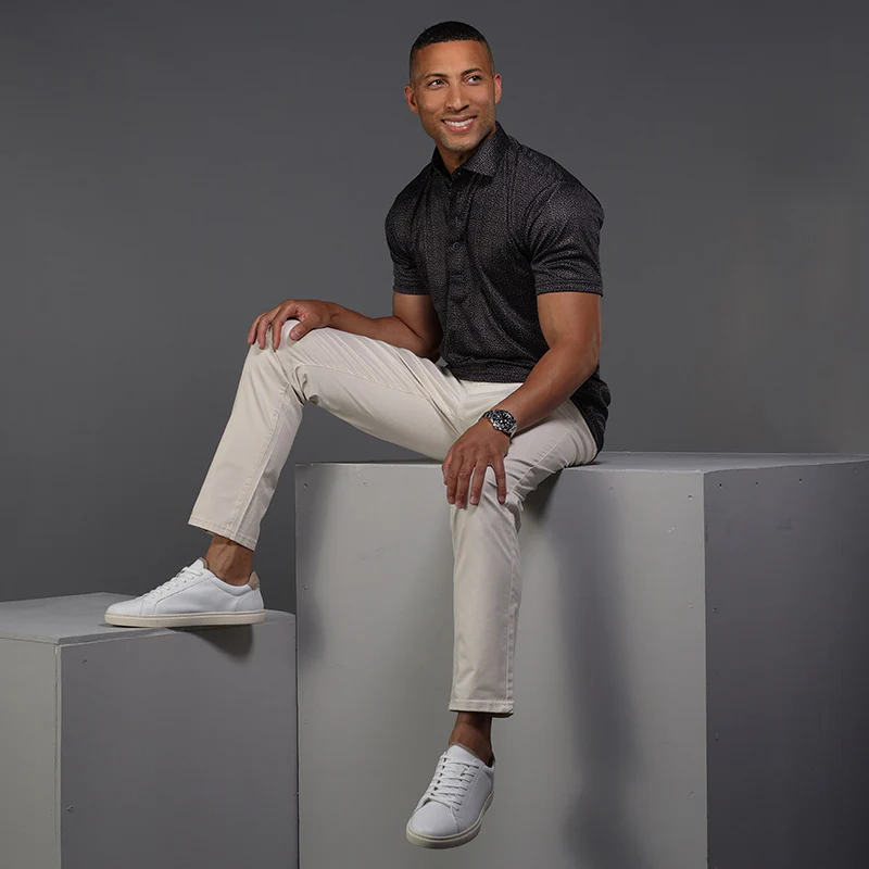 The versatile Semi-Spread Collar Polo. Woven for comfort and designed for style. This shirt pairs a formal semi spread dress collar with an extra comfortable, 4-way stretch, short-sleeved polo. The semi-spread collar has all the benefits of our ever popular English spread collar with a streamlined size and built to accommodate a larger tie knot